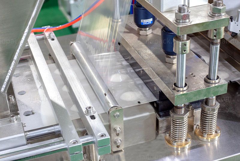 4. Automated packaging process: material sending, printing, filling, sealing, and cutting.