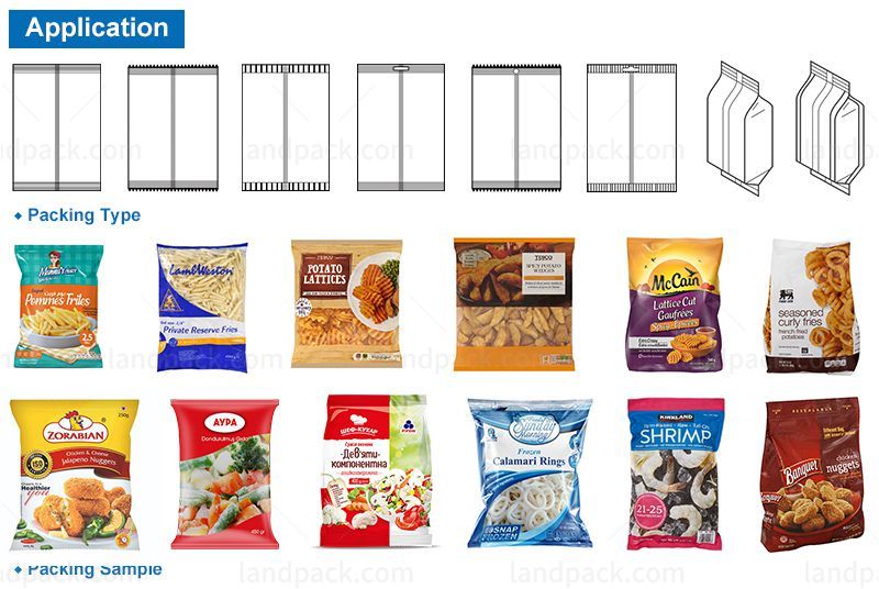 Suitable for packing and weighing many kinds of products such as: shrimp roll, peanut, shrimp chips, frozen shrimp, frozen fish, frozen seafood snacks, puffy food, popcorn, cornmeal, seed and sugar etc. which shape is roll, slice and granule.
