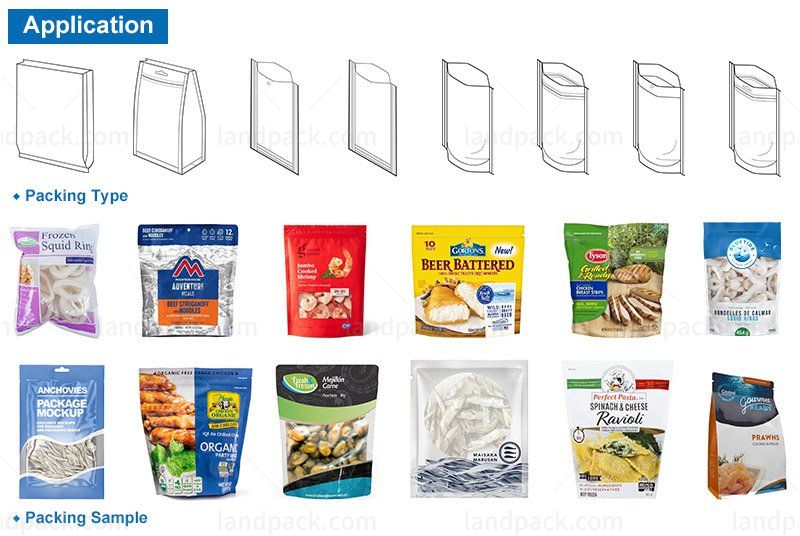 Suitable for automatic packing for grain and solid food, such as frozen food, frozen shrimp, frozen fish, frozen seafood, dog food, cat food, and other granular pet food, beans, nuts, dry fruits, candy, cereal, chocolate, biscuit, peanut, capsule, seeds, chemicals, sugar, etc.