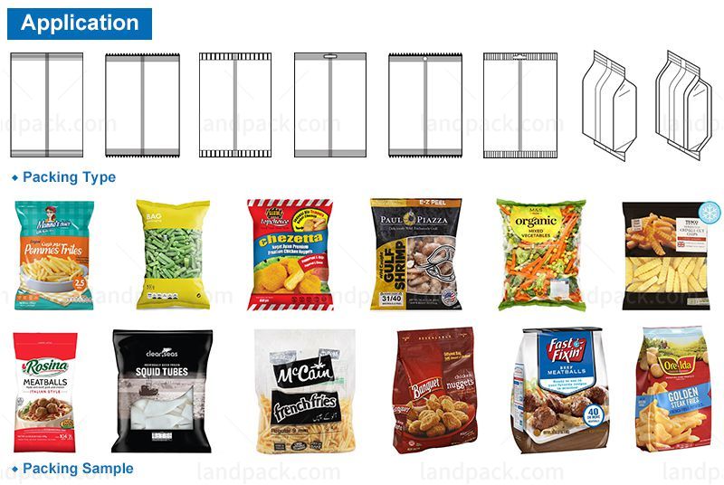Suitable for packing all kinds of grain material, sheet material, strip material and abnormity material which such as frozen food, sunflower seeds, peanut, nuts, beans, potato chips, popcorn, almond, dry fruit, vegetable salad, jelly, biscuit, chocolate, filbert, corn, pet food, dilatant foodstuff, hardware and plastic etc.