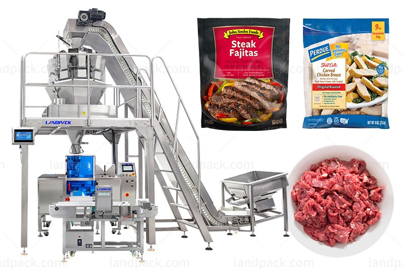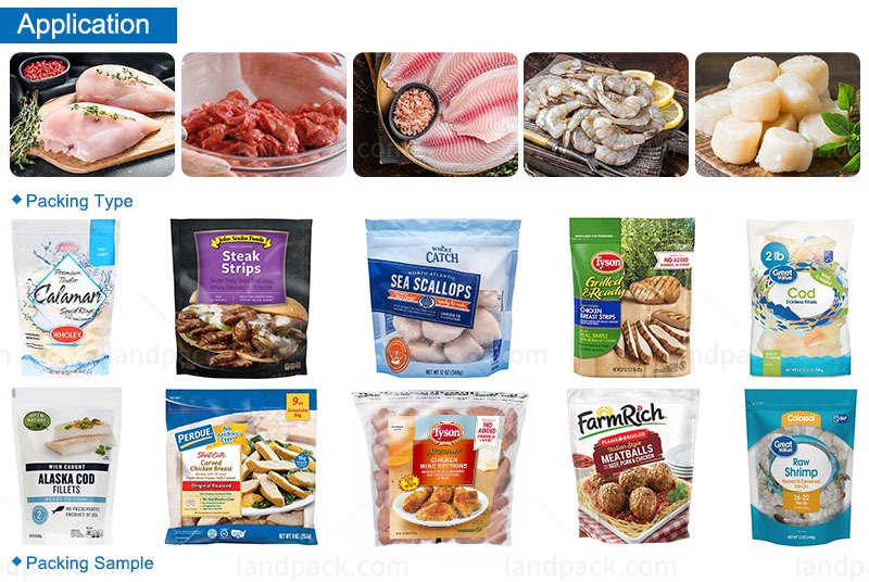 The frozen food packaging machine is ideal for efficiently packaging a variety of frozen foods, including sliced meat, dumplings, meatballs, shrimp, shellfish, chicken wings, beef, fries, tofu puffs, and more. It ensures precise weighing, sealing, and preservation to maintain product freshness and quality.