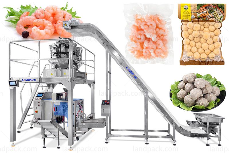 Multi-function frozen food shrimp meatball vacuum doypack packing machine is suitable for vacuum packing shrimp, meatballs, hotpot balls, fish balls, cuttlefish balls, and other frozen foods that require vacuum packaging.