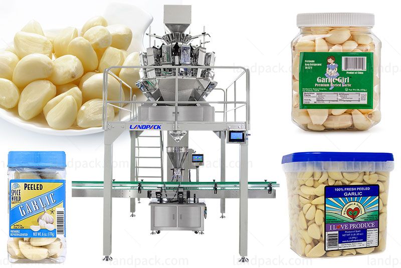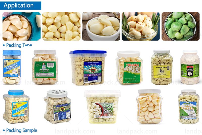 This jar filling machine is suitable for various granular products such as garlic, potato, peanut, pickle cucumber, puffed food, sliced dried meat floss, dried fish, nuts, pistachios, vegetable seeds, dried fruit, chips, popcorn, etc.