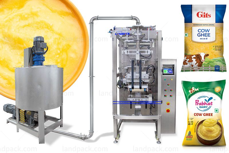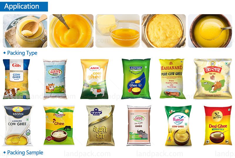 Automatic ghee pouch vertical form filling sealing packing machine suitable for packing all kinds ghee, fluid, paste, cream form material in seasoning-package, oil-package, sauce package, and others.