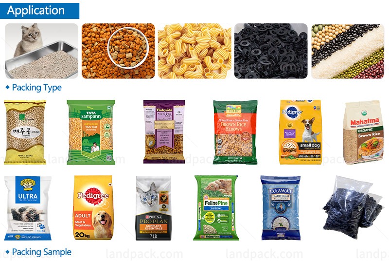 This machine is suitable for packing 5-15kg of granule materials, including toys, paintballs, marbles, nuts, pet food, puffy food, chips, jelly, candy, pistachio nuts, apple slices, frozen dumplings, coffee beans, pasta, cotton candy, french fries, rice, small hardware, and more. It ensures efficient and precise packaging for a wide range of products.