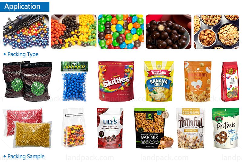Suitable to use in packing high accuracy and easily fragile material. Such as toys, paintballs, marbles, nuts, pet food, puffy food, chips, jelly, candy, pistachio nuts, apple slices, frozen dumplings, coffee beans, pasta, cotton candy, french fries, rice, small hardware, etc.