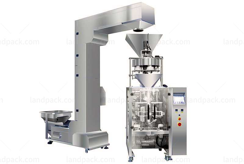 Vertical Full automatic volumetric cup filler metering packaging machine, apply to pack bulk grain, slice, short bar material products such as puffy food, popcorn, shrimp chip, salt, sugar, rice, sunflower seed, peanut, beans, nuts, pistachio, peas, instant oatmeal / cereal oats, etc.