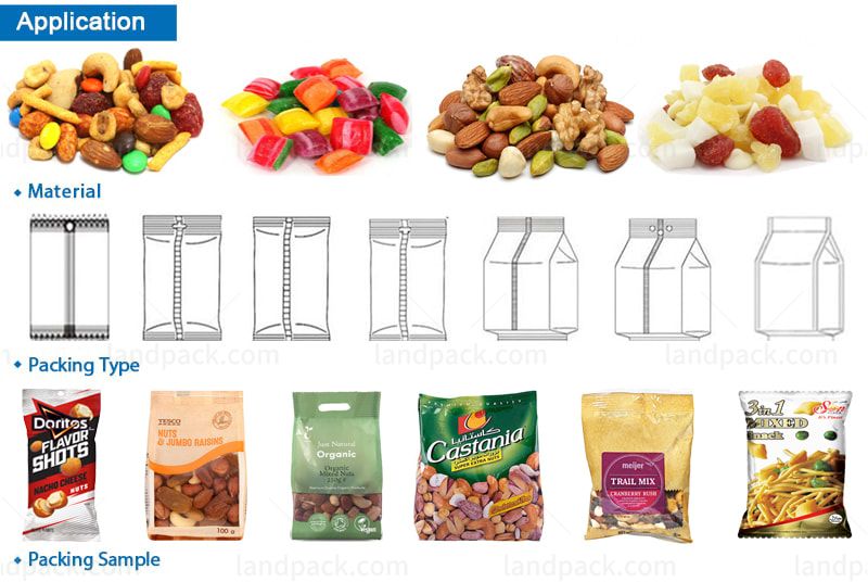Multihead Weigher VFFS Packaging Machines is suitable for packing all kinds of grain material, sheet material, strip material and abnormity material which such as candy, sunflower seeds, peanut, nuts, beans, potato chips, popcorn, almond, dry fruit, vegetable salad (shreded or sllices vegetables, like iceberg lettuce, cabbage, romain, spring onion and leek ect.), frozen food, jelly, biscuit, chocolate, filbert, corn, pet food, dilatant foodstuff, hardware and plastic can be weighed by the ration.
