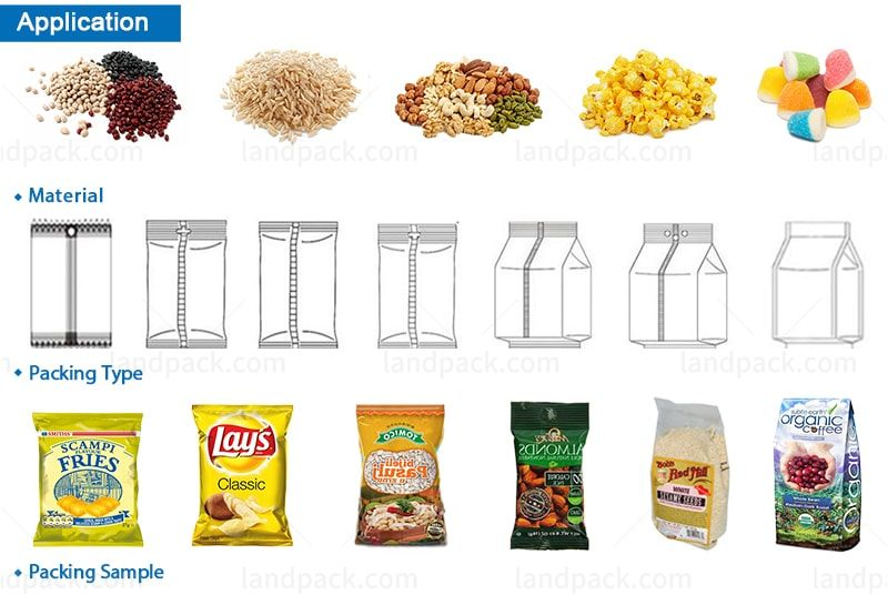 Suitable for puffed food, patoto chips, coffee bean, crispy rice, jelly, candy, pistachios, apple slices, banana chips, frozen food, vegetable salad, dumplings, glutinous rice balls, chocolate, pet food, hardware items, medicines and so on.