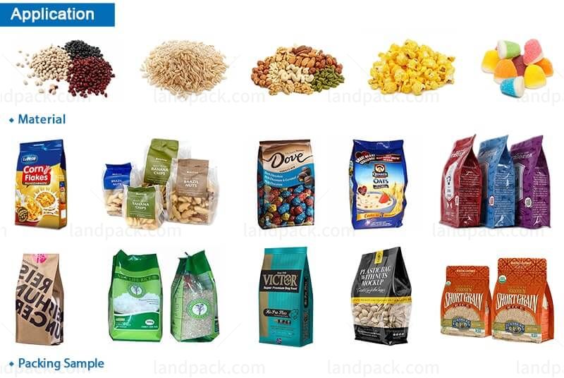 Quad seal bag / block bottom pouch packing machine is suitable for automatic packaging various kinds of leavened food, candies, peanuts, seeds and such materials in grain or piece as well as powder like milk powder, washing powder, starch, etc.