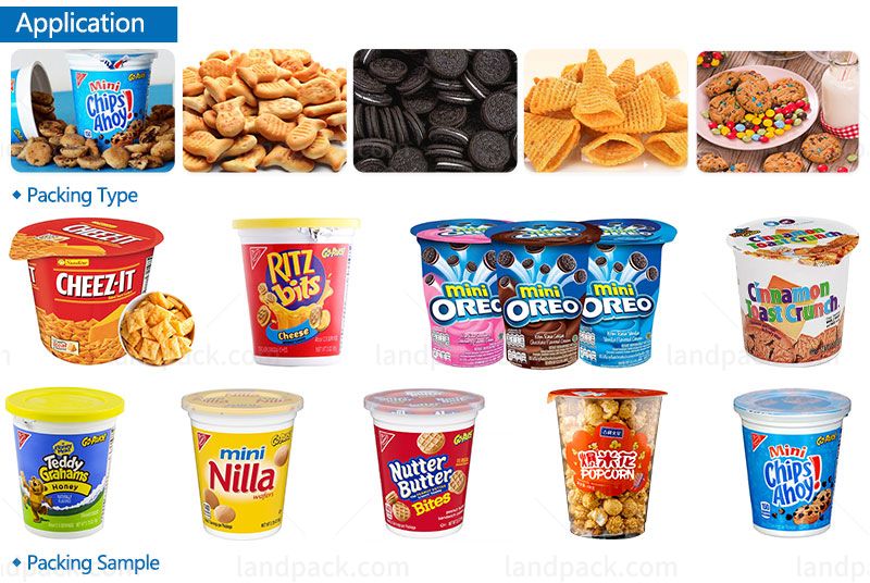 This cups filling sealing machine is suitable for the quantitative weighing of granular and solid materials, such as popcorn, flower, eclair chocolate, mini dry fruit, gummy candy, nuts, preserved fruits, Guoba, sugar, salt, seeds, rice, sesame, monosodium glutamate, small particles of more uniform materials.