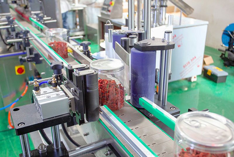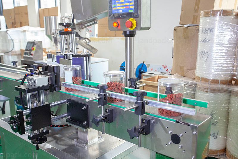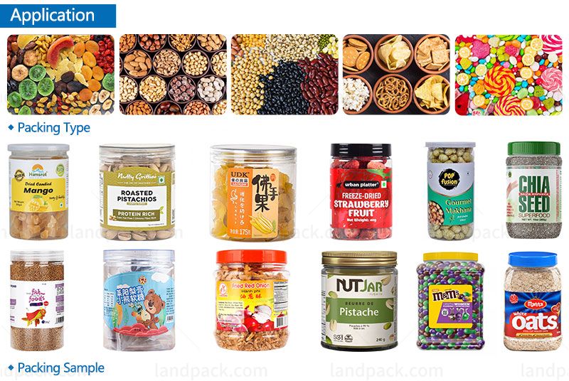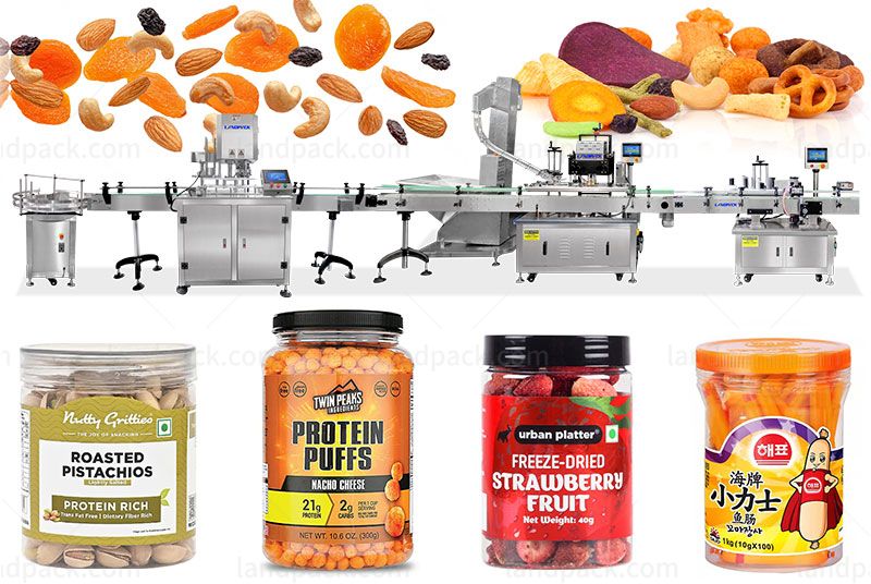 This automatic filling production line is used for canned food, sealing, capping and labeling the cans and bootle, Can effectively reduce air contact and extend the shelf life, such as goji berries, nuts, snack, raisins, popcorn, pistachios and other foods.