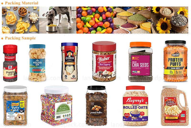 The automatic granule filling Line is controlled by a microcomputer and photoelectric technology, with high precision and fast speed. Suitable for nuts, cashew, beans, peanut, candy, sunflower seeds, popcorn, almond, dry fruit, vegetable salad, frozen food, jelly, biscuit, chocolate, pet food, etc.