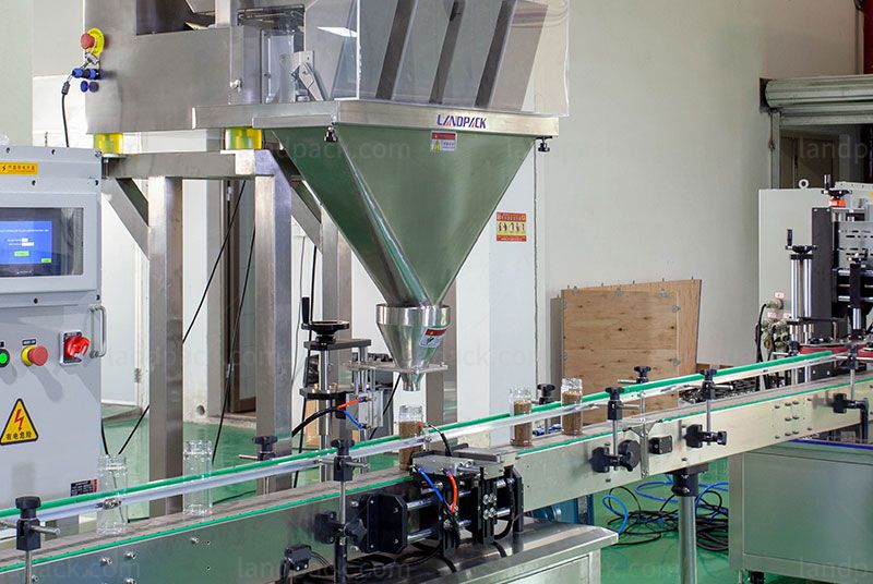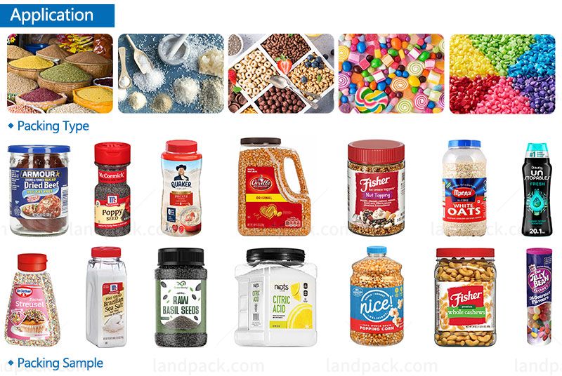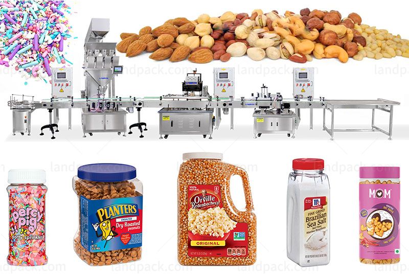Granule square round bottle filling capping labeling machine suitable for filling various granular products, such as nuts, beans, peanuts, candy, seeds, potato chips, popcorn, almond, dry fruit, vegetable salad, frozen food, biscuit, chocolate, filbert, corn, pet food, etc.