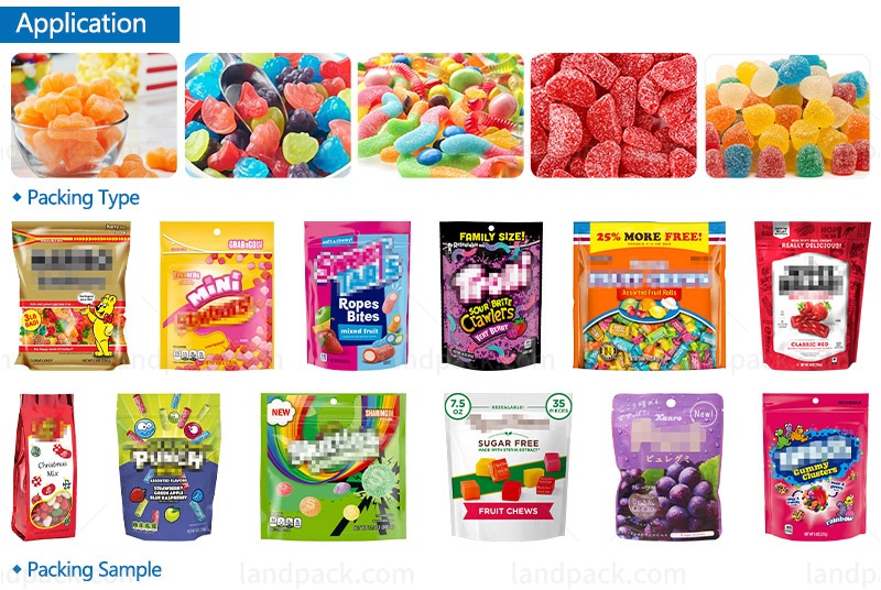 It supports multiple pouch formats, including stand-up pouches, zipper pouches, flat pouches, and spouted pouches. These flexible packaging types are ideal for gummy candies, offering excellent sealing integrity, product visibility, and portability.