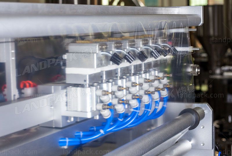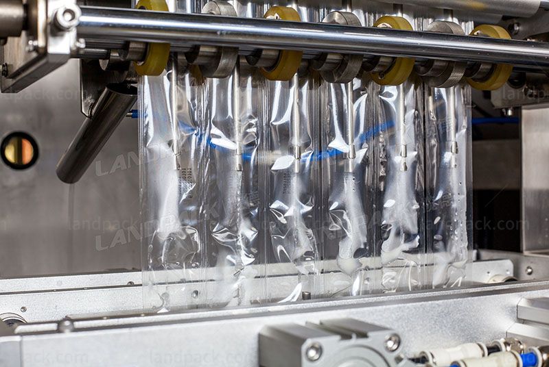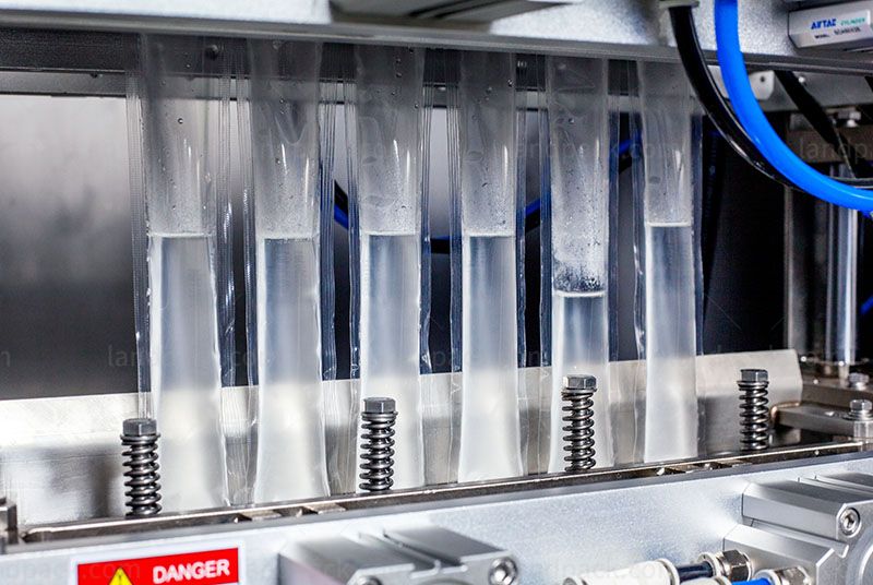 2. Machine main function: automatic split film at right position, liquid measuring and filling, multi lanes bag form fill seal, cutting, sensor tracking, counting capacity.