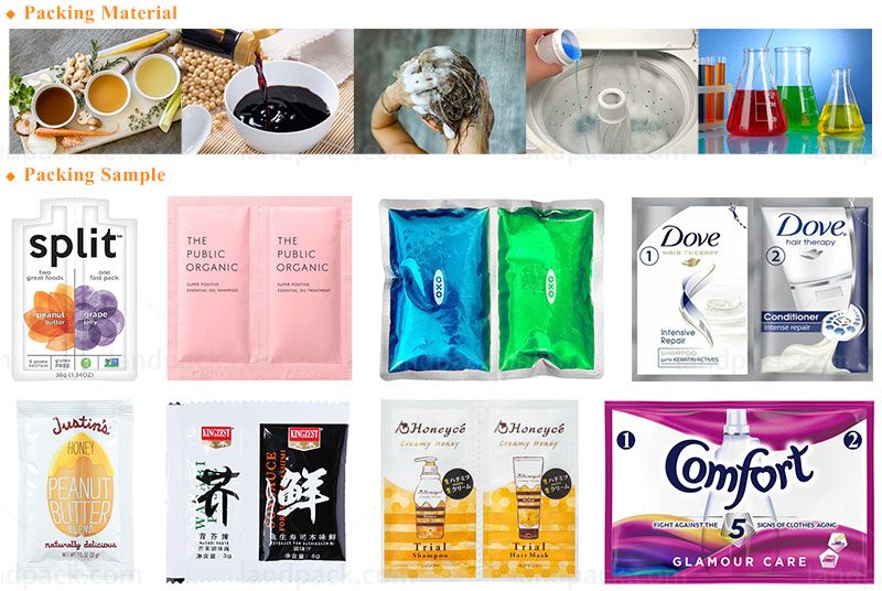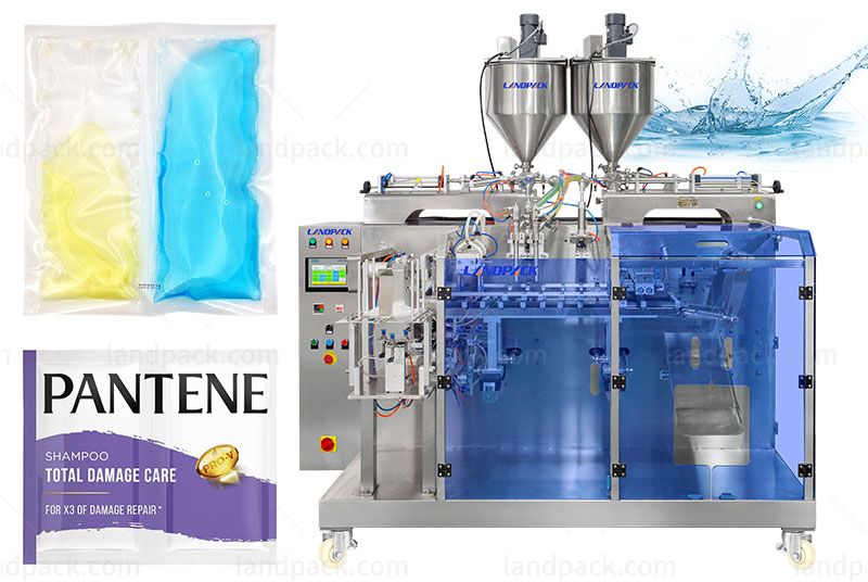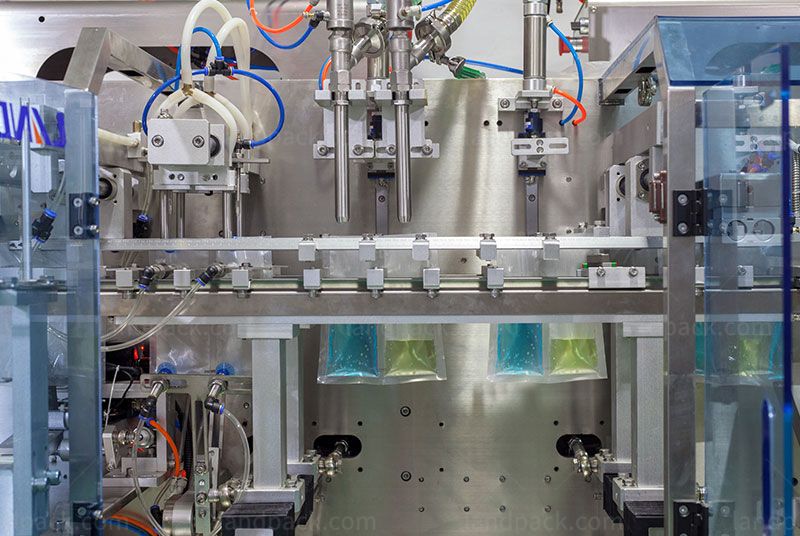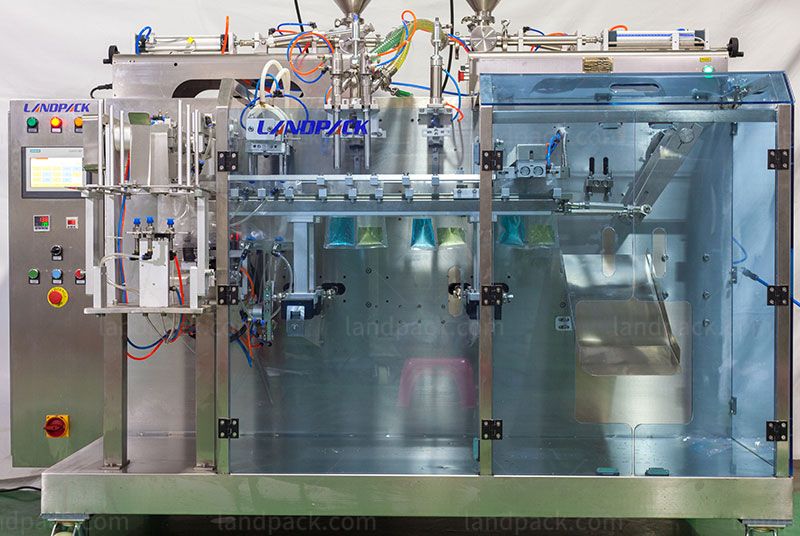 Automatic horizontal different liquid premade twin pouch filling packing machine, it is suitable for packing liquid standing bags, pre-made bags, zipper bags packaging, such as juice, cream, jam, laundry detergent, hand soap, sauces, honey, milk, etc.