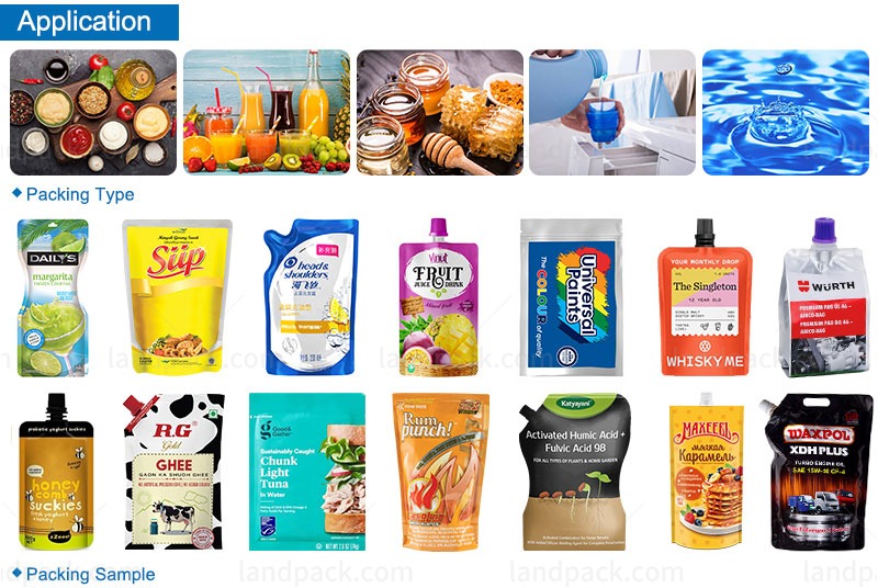 The machine is suitable for various liquid products and can handle different types of premade bags. It is ideal for packaging liquids such as honey, milk, oil, ketchup, paste, sauce, fruit juice, hand wash, and laundry liquid. When equipped with explosion-proof devices, it is also suitable for flammable and explosive liquids like alcohol, spirits, and disinfectants, ensuring safety and precision in the packaging process.