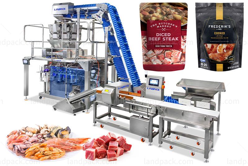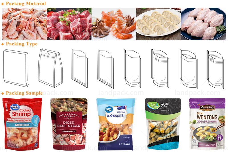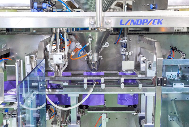 Landpack Horizontal Linear Doypack Machine Premade Zipper Ziplock Pouch Doypack Packing Machine, can be used for various preformed bags, such as three side seal bags, stand-up bags, ziplock bags, gusset bags, etc. to complete automatic bag pick-up, bag open, fill, seal and finished product output. It is suitable for all kinds of food packaging, such as coffee, frozen food, biscuits, Cereals, nuts, powdered materials, candy, etc. It can be used with screw scale, linear scale, combined scale and other filling equipment.