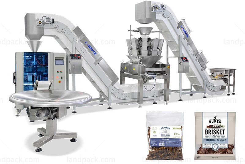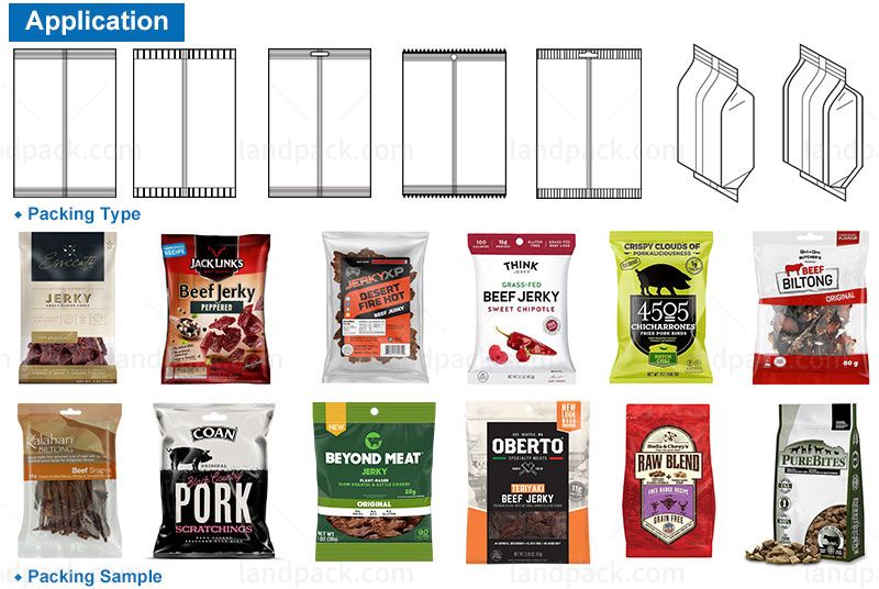 Automatic Beef Jerky Packing Machine With Secondary feeding + weighing. It suitable for packaging in food, agriculture, pharmaceutical, cosmetics, chemical and other industries. such as beef jerky, biltong, chicken nuggets, snack foods, frozen foods, vegetables, fruits, candies, chemicals and other particles.
