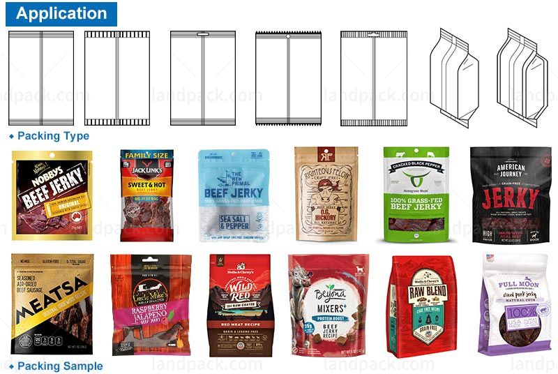 Suitable for automatic packing for grain and solid food, such as beef jerky, jerky, biltong, beans, nuts, dried mango, dry fruits, candy, cereal, chocolate, biscuit, peanut, capsule, seeds, chemicals, sugar, etc.