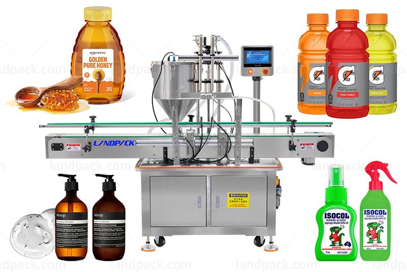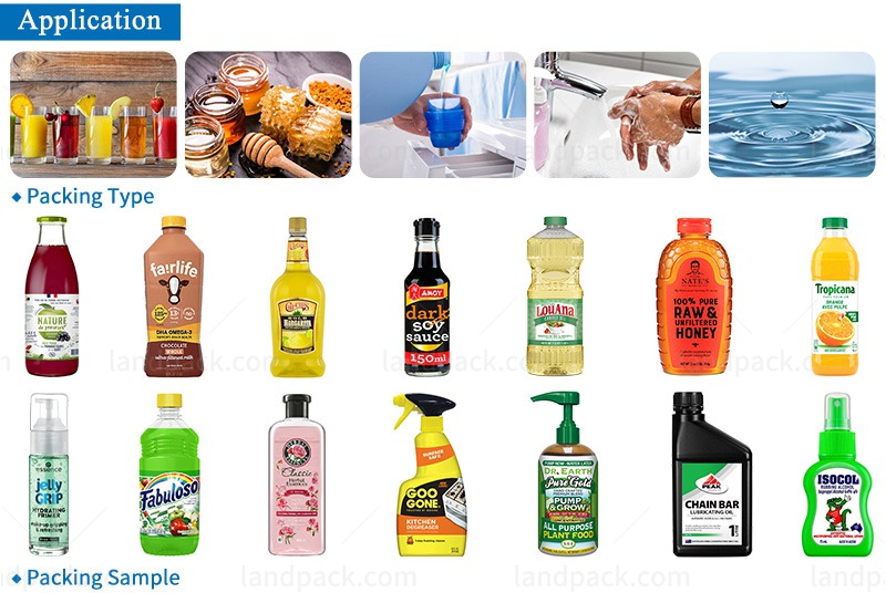 This liquid bottling filling machine is suitable for automatically filling various liquids into bottles such as syrup, fruit juice, shampoo, detergent, shower gel, sauce, honey, cooking oil, etc.