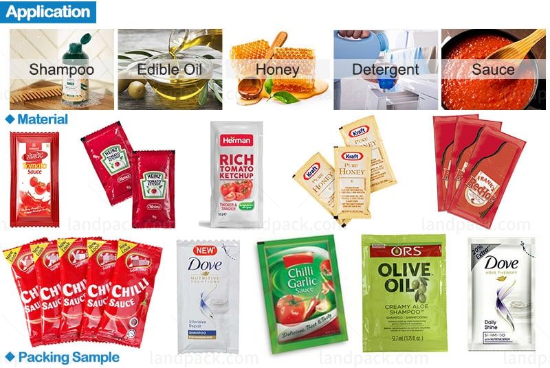 | Applicable industry | High speed 10 lane liquid 3/ 4 sealing sachet packaging machine, it is suitable for liquid products containing fine particles such as chili sauce, chutney, bean paste, instant noodle sauce, ketchup, paste, honey, cream, milk, butter, water, oil, vinegar, liquid seasoning, shampoo,etc. |
