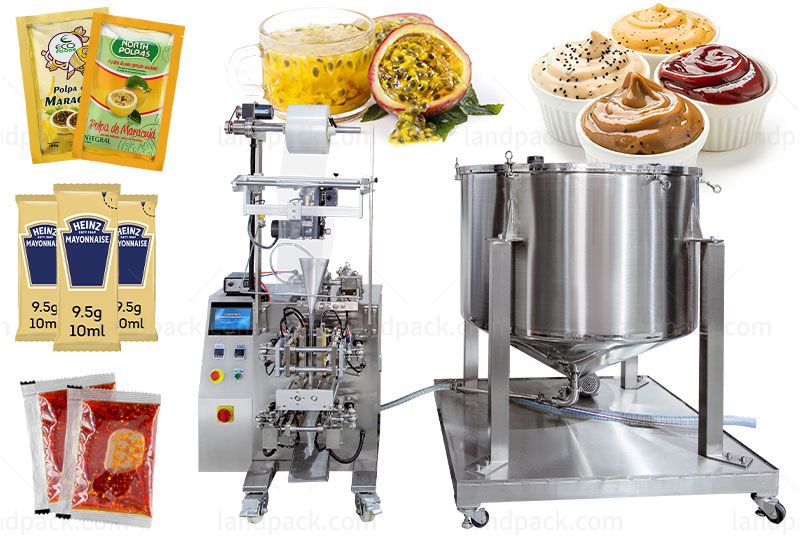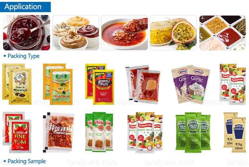 Suitable for all kinds of liquid materials such as fluid milk, water, honey, juice, tomato paste, ketchup, sauce, oil, etc. There are various bag types: E.G. back-sealing bags, 3-side seal bags, 4-side seal bags, stick bags, linking bags, etc.