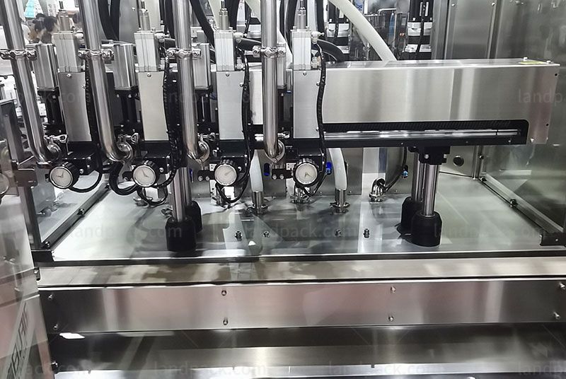 Follow-up high-speed double-head filling machine ,operated by chain conveyor, bottle clamping automatic alignment mechanism, filling mechanism, automatic servo following system, electric lifting adjustment mechanism, waterproof electric cabinet, touch-type man-machine Interface, etc.