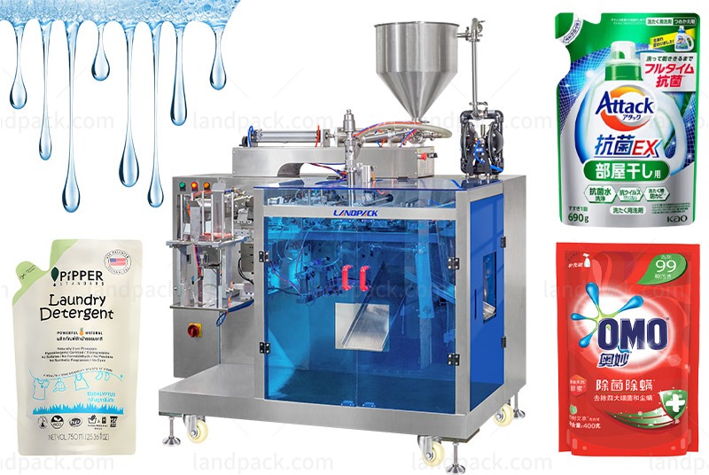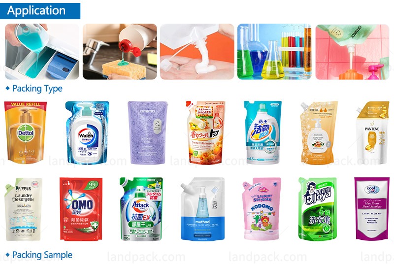 This machine is suitable for the automatic packaging of various liquid products in pre-made pouches. It is ideal for packaging liquid soap, liquid detergent, dishwashing liquid, shampoo, sauce, fruit juice, beverages, tomato sauce, peanut butter, jam, paste, and other liquid products, offering efficiency and precision for diverse industries.