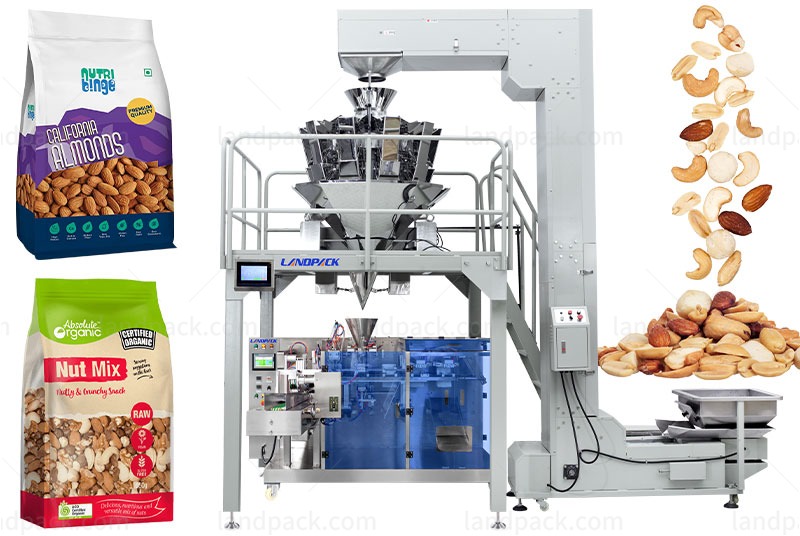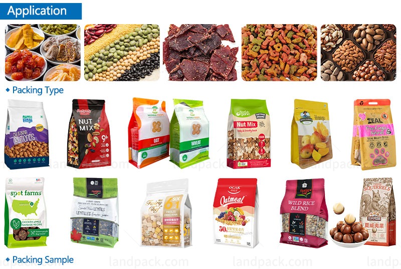 It efficiently packages these products into M-shaped pouches such as dry fruits, nuts, beans, cereals, seeds, peanuts, dry chili, dry tomatoes, dry flowers, candy, chocolate, and biscuits.
