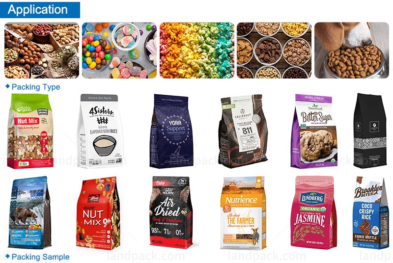 This versatile machine is designed for automatic packaging of grains and solid foods, including dry fruits, nuts, beans, cereal, seeds, peanuts, dry chili, dry tomatoes, dry flowers, candy, chocolate, biscuits, and capsules. It is suitable for M-shape pouch packaging, featuring adjustable settings, a user-friendly interface, and durable construction.