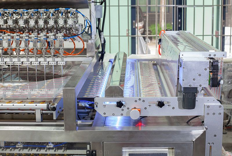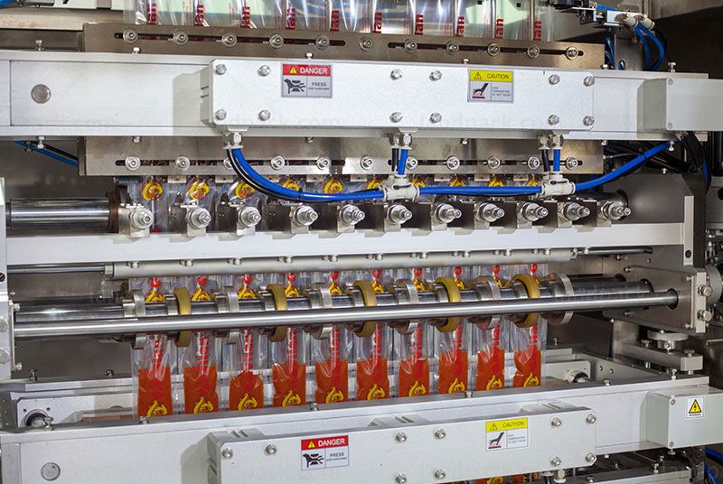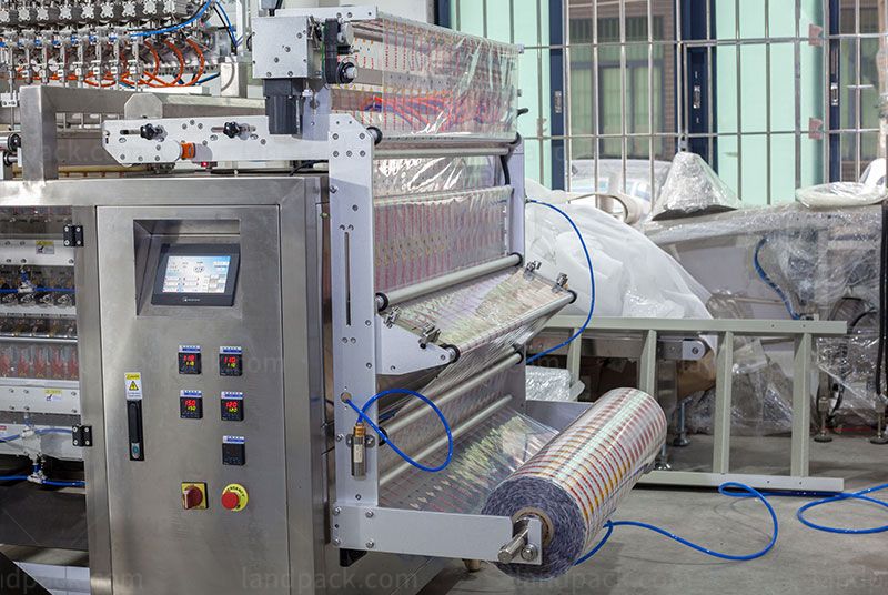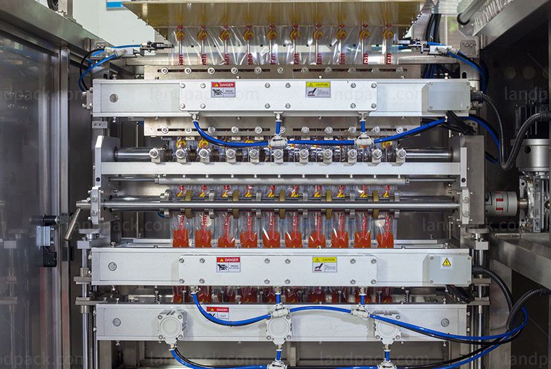 Machine main function: automatic split film at the right position, liquid measuring, and filling, multi lanes bag form fill seal, cutting, sensor tracking, counting capacity.