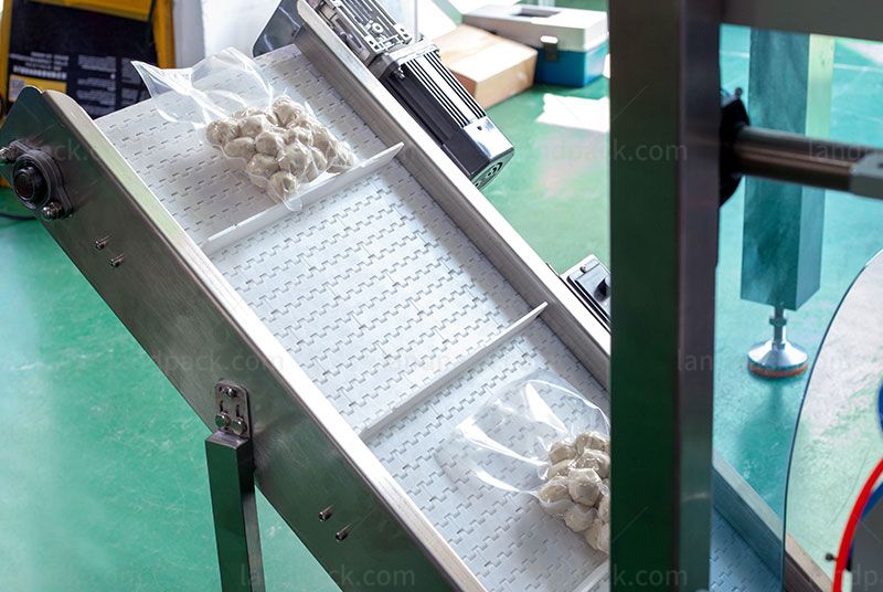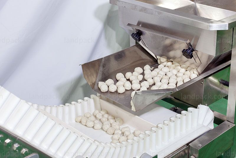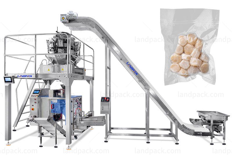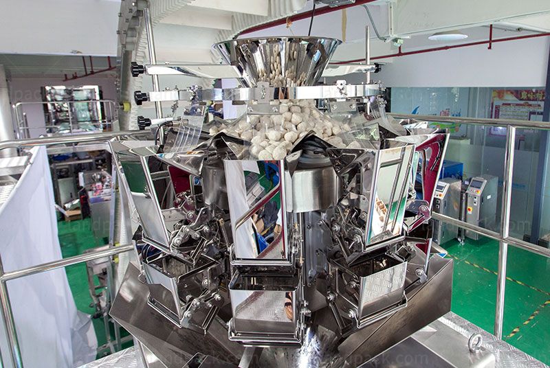 Multi-Function Vacuum Packing Machine With Multihead Weigher, It is suitable for vacuum packing for meatballs, hotpot balls, fish balls, cuttlefish balls, and other foods that require vacuum packaging.
