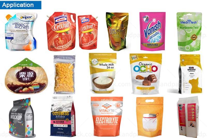 Typically weighing and packing granules, nuts and pulses, powder, fresh vegetable, fruit salad, snack food, tea and coffee, frozen food, confectionery, pets foods, bird foods, dog foods, cat foods, beans, grain, rice, sesame, sugar, salt, seeds, food additives, granola, muesli, fertilizer, berries, tomato chips, chocolate nuts, fodder, tablet, pepper etc.