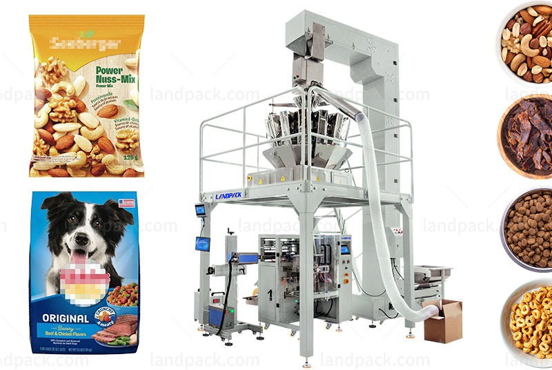 This nuts packing machine supports common bag formats such as pillow bag, gusset bag, back sealing bag, three-side seal bag, etc., in PET/PE, OPP/CPP, and aluminum foil material.