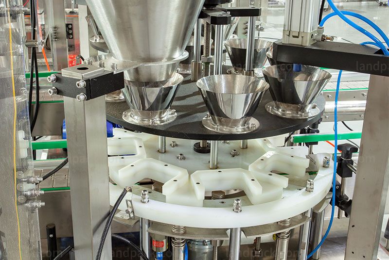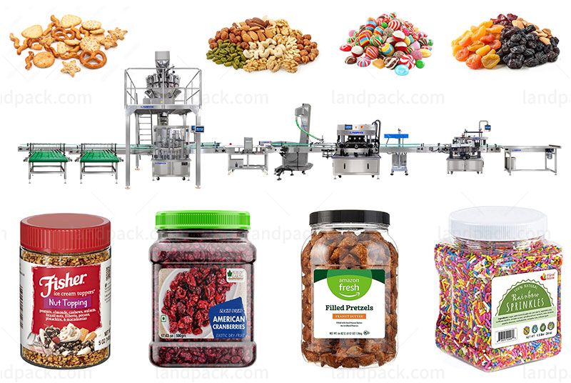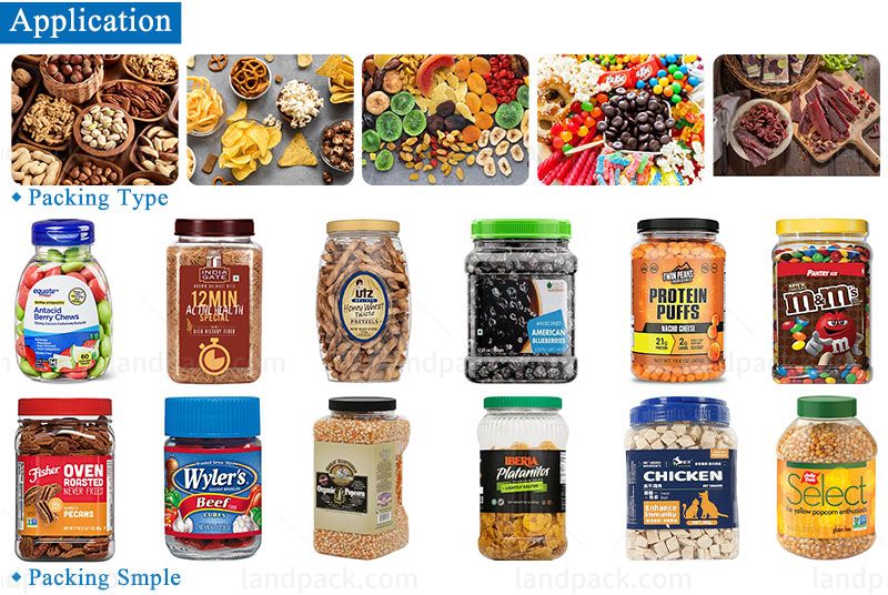 Suitable for automatic bottling canning and filling of various granular products. such as nuts, peanuts, beans, candy, sunflower seeds, potato chips, popcorn, almonds, dry fruit, vegetable salad, frozen food, jelly, biscuits, chocolate, filbert, corn, pet food, etc.
