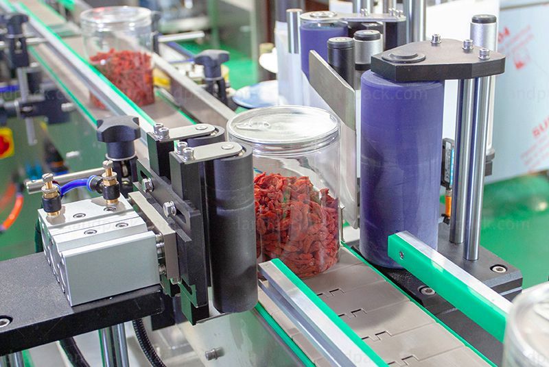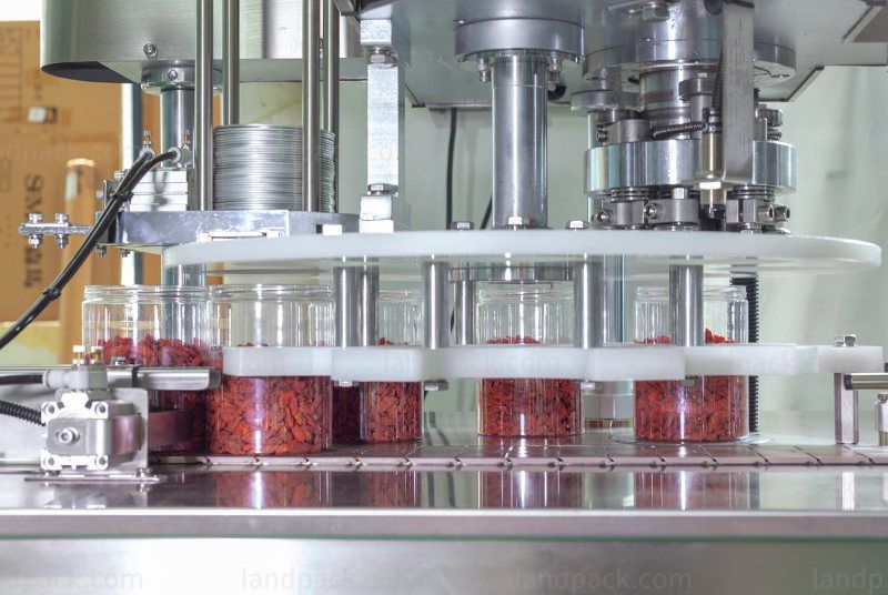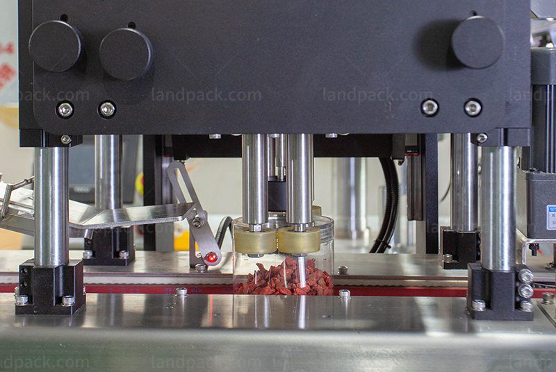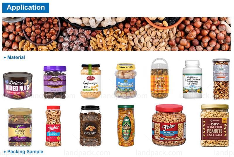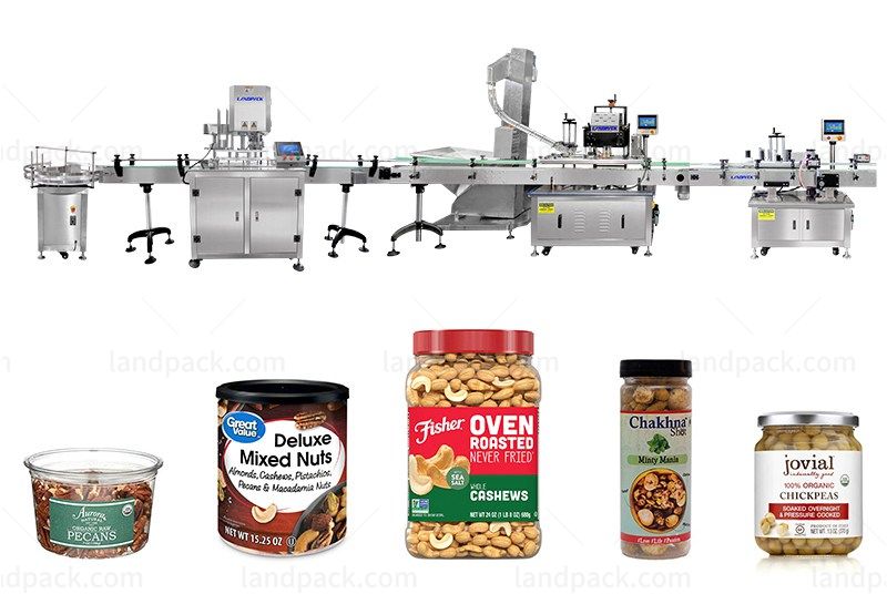 Automatic nuts bottle capping and labeling machine (LFH-HX-4), Ii is used for canned food, sealing, capping and labeling the cans. Can effectively reduce air contact and extend the shelf life, such as goji berries, nuts, raisins, popcorn, pistachios and other foods.