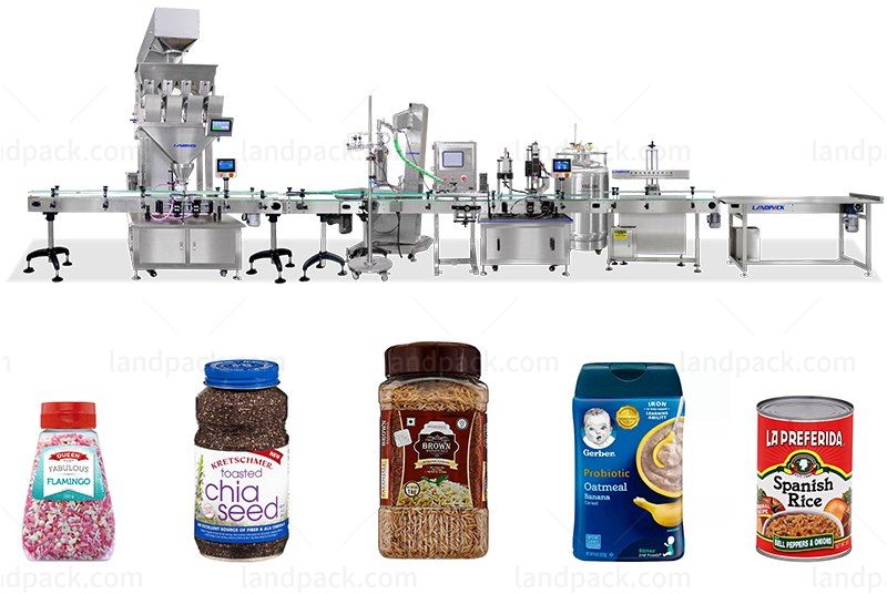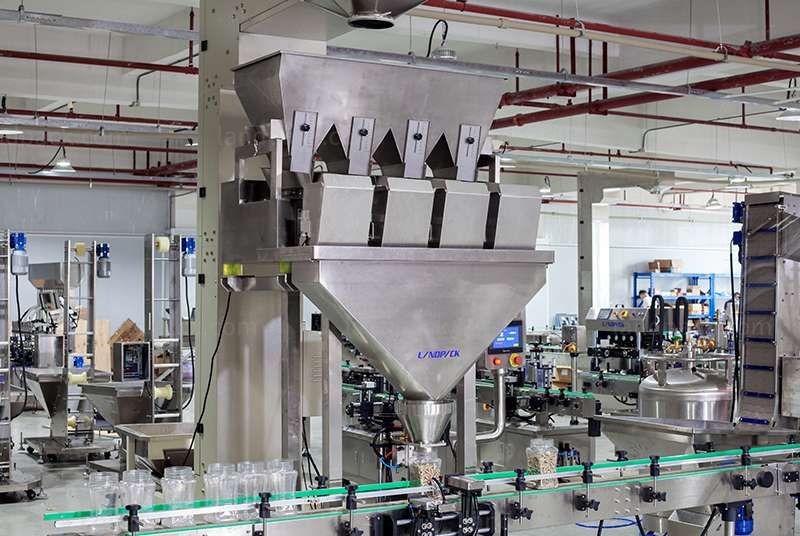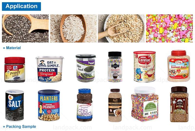 Automatic nuts bottle weighing filling capping and sealing machine, Scope of application: granular and solid materials such as nuts, beans, peanuts, snacks, cashew, sugar, rice, beans, condiments, washing powder, feed, desiccant, plastic pellets, grains, etc.