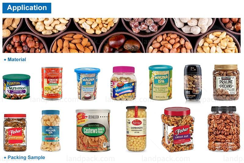 Suitable for packaging various granular products, such as nuts, peanuts, candy, rice, corn flakes, melon seeds, pepper, pepper, oatmeal, etc. Suitable for all kinds of containers on the market, such as plastic cans, cans, prefabricated bags, etc.