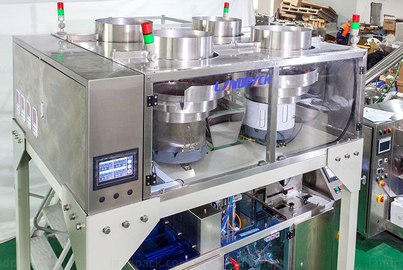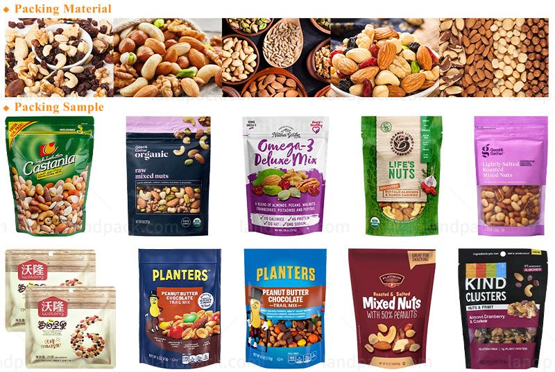 Landpack Economical Nuts Mixing Mini Zipper Pouch Doypack Filling Sealing Packaging Machine, it is suitable for conventional granular zipper bags, standing bags, pre-made bags packing such as nuts, spices, biscuits, beans, oats, candy, coffee beans, chocolate, pet food, potato chips, popcorn, dried fruits, etc.