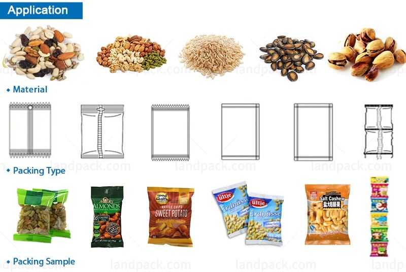 Suitable for packing for all kinds of grain material,sheet material,strip material and abnormity material which such as candy,melon seeds, chips, peanuts, nutlet , preserved fruit, jelly, biscuit, confect, camphorball,currant,almond,chocolate,fibert,cornpet foodstuff,dilatant foodstuff,hardware and plastic can be weighed by theration.