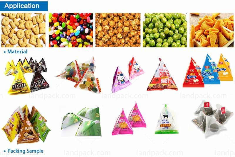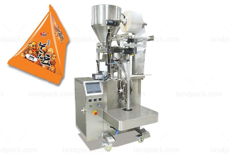 Triangle Bag Packing Machine suitable for three-dimensional triangle bags packaging for grain and regular-shaped products, such as Nuts, Peanut, Beans, puffed food products, shrimp balls, peanuts, popcorn, oatmeal, melon seeds, etc.