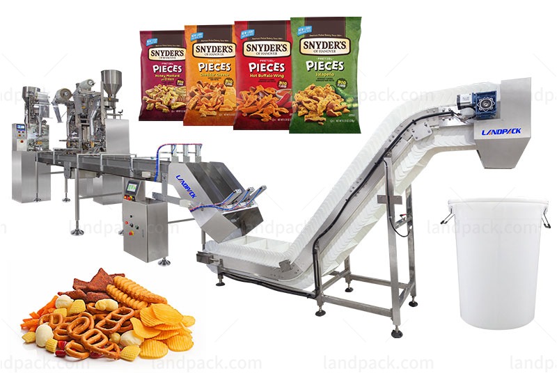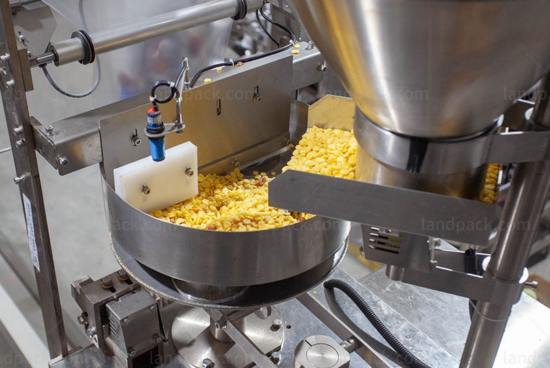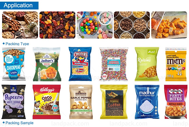 The machine is suitable for packaging a wide variety of snacks and granular or piece materials, including corn flakes, puffed food, soybeans, coffee beans, cashews, wheat, oats, corn kernels, shrimp bars, candies, peanuts, popcorn, rice, and more. It ensures efficient and reliable packaging for diverse products.