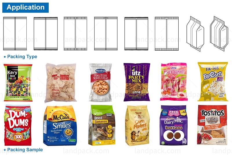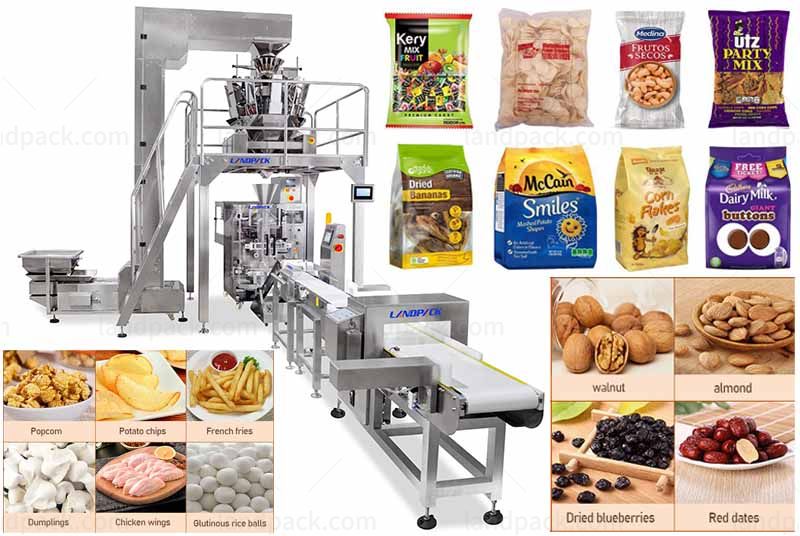 Automatic Pouch Packing System With Labeling Machine Metal Detector And Weight Selection Scale, it is Suitable for a variety of high-value products, such as nuts, dried meat, frozen food, dried fruits, meat, candy, etc.
