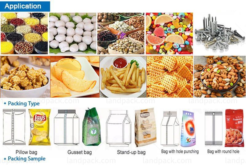 Suitable For Packing Puffed Food, Potato Chips, Snacks, Popcorn, Candy, Biscuit, Sunflower Seed, Pistachio, Peanuts, Chocolate, Nuts, Pet Food, Small Metal Parts And Plastic Parts, Etc.