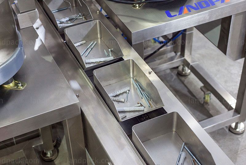 Full automatic multi-granule material counting packing line is suitable for various hardware parts and plastic parts. For example hardware parts, nuts, bearings, bolts, plastic parts, screws, fasteners, bearings, mixed nuts, pet food, frozen food, candy, dry fruit, etc.