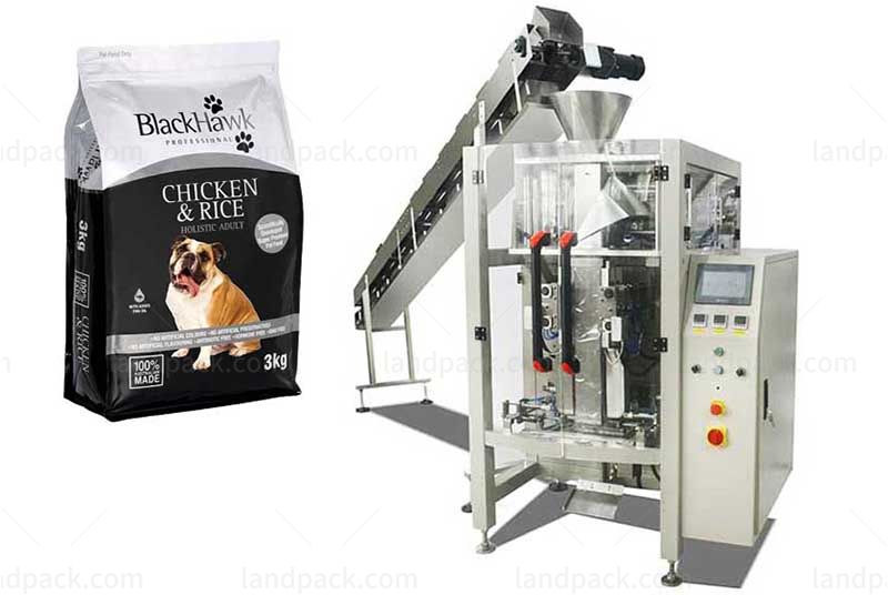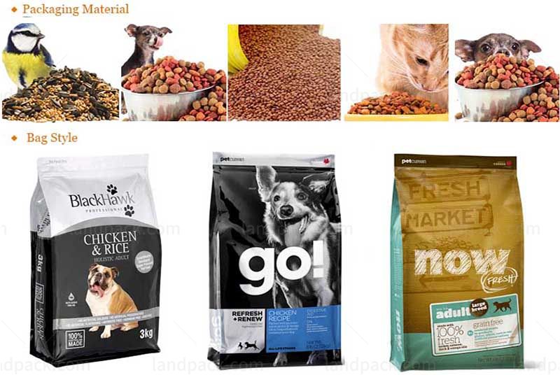 Automatic pet food quad seal bag/ block bottom pouch packing machine is suitable grain and solid food, such as dog food, cat food, fish food, bird food, and other granular pet food etc.
