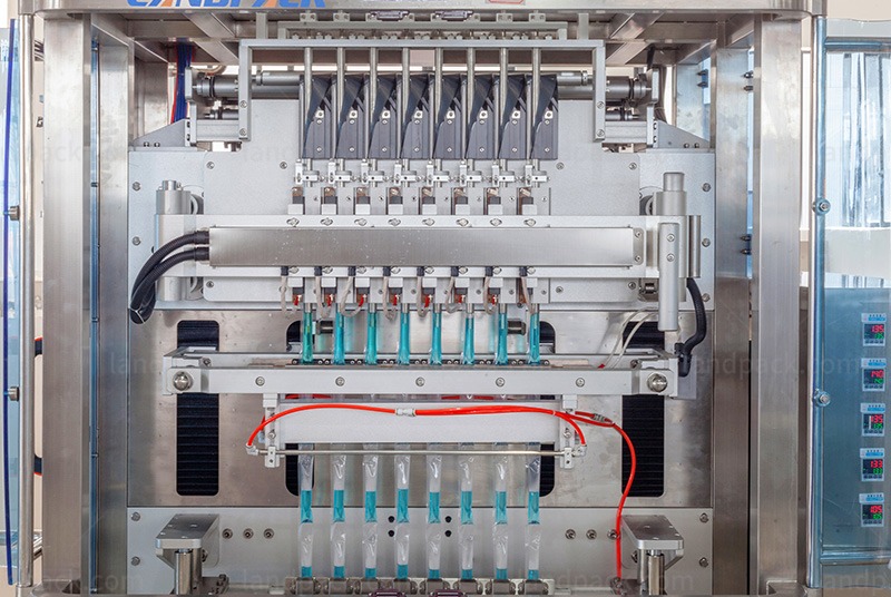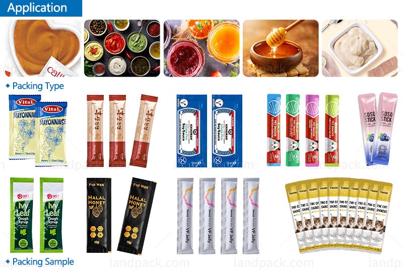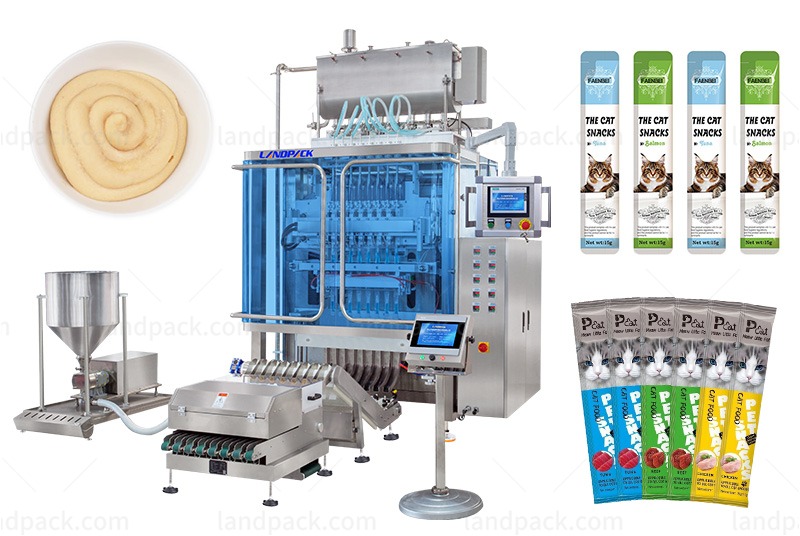 Multilane pet food cat strip stick packing machine is suitable for liquid products such as cat strips, meat paste, mouthwash, ketchup, flavoring, sauce, pasty, shampoo, syrups, salad dressing, cream, body wash liquid, etc.