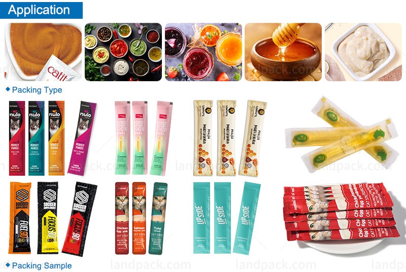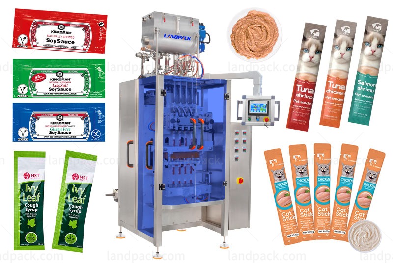 High speed multi lane cat puree cat strip pet food stick packing machine is suitable for liquid products such as cat strips, meat paste, mouthwash, ketchup, flavoring, sauce, pasty, shampoo, salad dressing, cream, body wash liquid, etc.